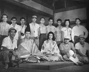 | 大映京都撮影所セットにて前列左より本多省三(撮影)、市川雷蔵、若尾文子、森一生、中岡源権(照明)、後列太田昭和(助監督)、小林昌典(美粧)、藤岡輝夫(スチール)、白波瀬直治(色彩技術)、楠三郎(製作進行)、西岡善信(美術)、谷口孝司(編集)、竹内衣子(記録)、林土太郎(録音)の諸氏。(キネマ旬報No.296より) |