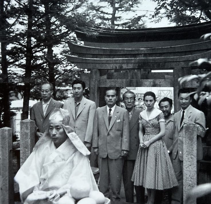 左から溝口健二監督、雷蔵、酒井所長、大矢市次郎、久我美子 水谷浩、宮川一夫