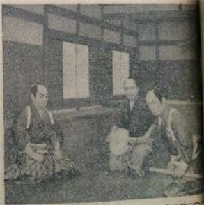 ▽渡辺君の『伊賀の水月』は柳生道場のシーン。長谷川一夫の荒木又右衛門が黒川弥太郎の柳生但馬守が極意を伝授するという緊張した場面で、わざわざ名古屋から新陰流二十世柳生厳長氏を招き、指導を受けるという懲り方。激しい気合のこもった立ち回りに、長谷川、黒川の両剣豪、たちまちグロッキーだが、柳生先生から「なかなかご器用なものです。新陰流中段、いわゆる正眼斜立ちの構えを指導しましたが、すぐのみ込んでしまった」とほめられ、極意真剣白刃どりの伝授?を受けた。