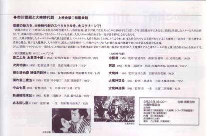 見果てぬ夢の映画スター 顔大短身。 というのは、読んで字の通り、顔が大きくて身丈が低い。ということなのですが、これは『安吾「日本史談」』の「源頼朝」に出て来る言葉です。頼朝という人の体形がそうだったらしい。 顔大短身という漢文的表現で充分なのですが、それをもう少し口語調にすると、顔ばっかりデカくて、小ぶとりで寸づまり、ということになり、なるほど、そうした体型ならば、思い出す時代劇スターは沢山います。千恵蔵、右太衛門、勝新、長谷川一夫、大河内傳次郎、阪妻、嵐寛、と、思い出すままに並べてみれば「顔大短身」こそが、日本の時代劇スターの正統といえる系譜なのではないか、という気さえしますが、「短身」はともかく、「顔大」がスクリーンで好まれたのは、顔がデカイほうが、昔の暗い照明の舞台では見映えが立派だという伝統から来ているのだ、という説を、たしかマキノ雅弘が言っていたように覚えています。 しかし、戦後生まれの私などの眼から見るまでもなく、大正生れの私の母などからすでにそうだったのですが、クーパーの顔小長身(というか、長足)が素敵!という女学生たちにとって、顔大短身の時代劇スターは、メンコでもブロマイドでもいいけど、奴凧なり、押絵のハゴイタの中に収まってたら?という存在だったのは確かです。 もちろん、アメリカにもヨーロッパにも、ジャン・ギャバンや、ジェームス・キャグニーという顔大短身のスターはいますが、アジアの女学生は、幼稚な中学生ではありませんし、少しインテリ気取りですから、アラカンや阪妻のデカイ顔は野暮ったいし、ましてや、小デブの丸顔が眼張りバッチリの長谷川一夫なんて、てんでぞっとしないのとは全然違って、顔が大きくて短身でも、違うのよ、粋じゃないの、ぐっとくる、というのが当時の女学生の意識だった、と、大正生まれの母親は申しておりましたのを、思い出します。 そうした「反・顔大短身」派の映画ファンにとっても、市川雷蔵は人気があった、ということを書きたかったのです。 言うまでもなく、雷蔵という映画スターの魅力の大きな部分をしめるのが、あの美しく、ほっそりと姿の良い立姿です。デビューから15年間、158本もの出演作(これは驚異的かつ殺人的な数字です)のなかで実に様々な役を演じているにもかかわらず、多くの人は、雷蔵と言えば、眠狂四郎か机竜之助の黒紋付きの着流し姿を思い浮かべるでしょう。ヤクザ風のわざと細身に仕立てた微塵縞の着流し姿の美しさ、と言うと、ほとんどの男は、鶴田、高倉の名前を出すところでしょうが、私はあえて、池部良、田宮二郎、そして戦後の顔大短身スターの代表、勝新太郎を挙げます。しかし、です。勝新はむろん、論外ですが、黒紋付きの着流し、となると、この二人も決して雷様にはかないません。千恵蔵の紋付き着流しは、姿がいいのですが、雷蔵には負けますし、大河内の白紋付き(?)着流しも異様さが捨てがたい魅力とは言え、美しいというものではなく、まして、仲代達矢、平幹二朗、田村正和などは、無様で、お呼びじゃない。 しかし、さらに、雷様にはそれ以外の衣裳がぴったりと美しい姿に決ることも言うまでもないことなのですが、『若親分』シリーズで雷蔵が正装の海軍軍服から、ヤクザ・スタイルに変身という、ファン垂涎のサーヴィスで見せた着流し姿は(あえて言うのですが)ファン・サーヴィスにとどまっていたように思えます。 もっといろいろ、書きたいことは、まだまだあるのですが、軍服姿(『陸軍中野学校』では、陸軍でした)が禁欲的かつ官能的に美しく決る日本人の映画スターは、雷蔵の他には『ラ・バタイユ』の世界的スター早川雪洲を数えるのみでしょうし、アラン・ドロンより2歳年上の雷蔵が、早川雪洲と同時代に生れていて、ハリウッドに行っていたら、と、つい仮定の空想をしてしまいもするし、さらに、『チート』のあの東洋のサディストの役を雷蔵がリメークしたら、とか、さらには、ジョン・ローンの『ラスト・エンペラー』も『イヤー・オブ・ザ・ドラゴン』も(なにしろ、ドラゴンなのですからね、龍と雷は、水と雨によって強く結びつけられています)、ありゃぁ、雷蔵の役だよ、と、私は思うのです。ジョン・ローンのように、雷蔵は甘えたフヌケ顔をしていませんし、中国服だって凄く似合うのは『陸軍中野学校』で証明ずみですし、ダンスだって(これは、実はあまり上手くなかった)、大映で奴隷なみに働かされずに、時間があれば、円月殺法くらい様になったはずですし、殺し屋の役は、もちろん、はまり役だ、と、見果てぬ夢がふくらみます。 市川雷蔵は、そういう映画スターなのです。