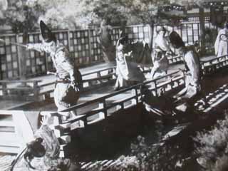 もう時間は二時を過ぎた。では、もう一度「動き」をやってみましょう。と云う助監督の声で、一同「動き」のスタートを切る。キャメラもこれについて動いて行く。これでOKとなれば、次はいよいよ衣裳をつけての本番だ。さすがに凝り性の溝口さんも、追い込みとなるとそうねばらずに、どうやら本番が見られるらしい。と思ったとたんに、異変が起った。廊下の板敷きがどうも少しやわだと云うことになった。何しろ紫宸殿と清涼殿をつなぐ廊下だから、がっちりしていないといけないらしい。