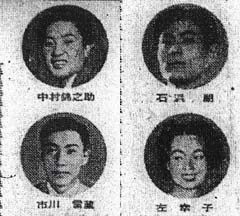 最も年代の若いファンの人気を一身に集めて人気投票のトップを持続している中村錦之助は、昭和二十七年、美空ひばりの新芸プロに入って『ひよどり草紙』でデビューしてから一年後、東映で『笛吹童子』の連続活劇の主人公として再スタート。さらに一年、今年正月の『紅孔雀』でチャンバラ・スターのチャンピオンとなったが、爆発的人気のすさまじさはどうも演技を認めての人気とは素直に受けとれぬ、いささかヒステリックな感じ。