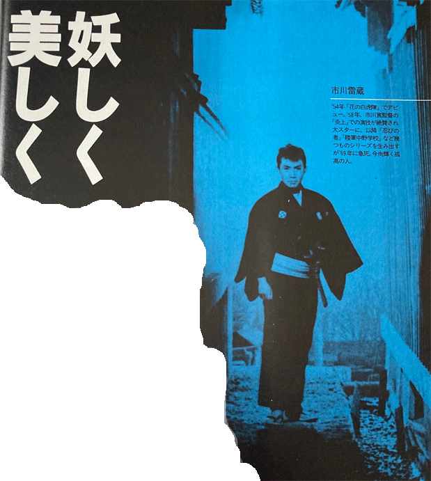 雷蔵は、16年間の俳優生活で150余本もの作品に出演しているが、中でも圧倒的な数を誇るのも時代劇だ。 デビューの頃は『花の白虎隊』や、溝口監督に厳しく指導された『新・平家物語』のように正統派の若侍やお殿様役が濃いけれど、次第に役柄が変化してくる。 『弁天小僧』や『安珍と清姫』、『好色一代男』のように歌舞伎出身の持ち味をいかしたものもあれば、『浮かれ三度笠』や『花の兄弟』のような髷物コメディもある。同じ時代劇でも、役に応じてガラリと顔が変わり、どんな役でも様になる。その芸域の広さは凄い。