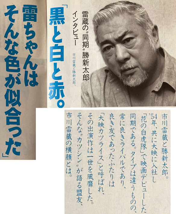 「俺と雷ちゃんは同期なんだけど、会社の扱い方が違ってた。カツシンの映画はカラーじゃなくていい、俺はそういう扱いをされてたらしい。俺は知らないんだけど、(中村)玉緒なんかも、俺の相手役は断わってたらしい。結婚してから聞いたんだけど、“なんで俺の相手役は断わってたんだ?” “雷蔵さんのは監督さんもいいし、台本もいいし、みんないいひとばっかり集まって映画を作ってましたやろ”」