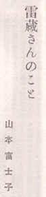 先ず一周年記念本当にお目出度う御座居ます。心からお慶び申し上げます。とあらたまりますと、さてどんな事をお書きしてよいやら一寸ばかりとまどいます。ファンの皆様方はスクリーンの雷蔵さんはもうすでに御存知の事ですし、今更私がとやかく申し上げる事も御座いません。 そもそも私が初めて雷蔵さんにお目にかかったのは『踊り子行状記』の時でした。お互いに最初の共演の事でもあり、いささか気取っていて雷蔵さんは貴公子然とすまし、私もいくらかすましておりました。それが或る日ロケーションに参りますバスの中で雷蔵さんを始め勝さん林さん等と「早口言葉をやろうじゃないか・・・」という事になり、やり始めますと私はどうにも下手くそで全然舌が廻りません。何回いい直してもとんでもない言葉が飛び出して皆に大笑いされてしまいました。中でも一番大きな口を開けて一番大きな声を出して笑ったのが雷蔵さんでした。それ以来お互いにすまして気取っても通用しなくなり、私にとっても昨日の貴公子は“やんちゃで、毒舌家の親しみやすい坊ちゃん”?となりました。今でもあの時の楽しかったロケバスの出来事が鮮やかに想い出されます。 その後何本か御一緒に本数を重ねるにつけ、次第に毒舌も辛らつさを増し、私も負けずに憎まれ口をたたきます。でも雷蔵さんの毒舌には不思議と腹のたたないユーモアがあり、スタッフの人にも皆に愛され、スクリーンでは見られない別の魅力が大いに会社の中を明るくさせて下さいます。 時代劇の撮影で京都へ参ります時、雷蔵さんのあの毒舌にふれる事が最大の楽しみであり、余り笑わされてしわでも出来やしないかと心配でもあります。現在『人肌孔雀』で御一緒ですが、これには私が初めて男装の若衆姿で出ますが、又冷やかされるのではないかと、ひそかに案じています。 今日はお仕事を離れて普段の雷蔵さんの極く一端なりでも・・・と思いましたが、どうも私の拙ない文ではあの生々しいわんぱく坊ちゃんをとらえる事が出来ませんでした、悪しからず。現代劇の『炎上』に意欲を燃えたたせていらっしゃる雷蔵さんに大いに敬意を表しますが、又楽しい夢のある時代劇でもどうぞファンの皆様を楽しませて下さいませ。そして今後の御活躍をファンの方々と共にこころよりお祈り申しております。