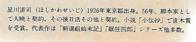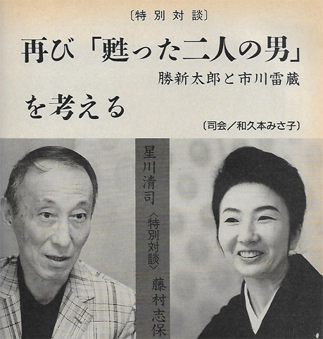 星川 私、ひところ、あの人が三十七歳で死んだということが非常に心残りだった。でも、近ごろこれで良かったのかなと思えるようになってきました。これも何かの思し召しなのかな。というふうにだんだんと思えてきたんです。雷蔵という人は、幻影になったんだ。幻影というものは、ときとして生身の人間より鋭く、生きている私たちに迫ってきますからね。そういう市川雷蔵でいいんだ、というふうに思い込もうとしている、というのが正直な気持です。でも、私にしろ藤村さんにしろ、雷蔵といっしょの仕事がたくさん出来たはずなんですよ。ただ一つ、あの人がテレビの仕事に手を染めなかったのは良かったな、と私は思っています。これはテレビジョンがどうこうということではなく、雷蔵さんのために良かったと思う。