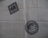 寿の字海老:成田屋 意匠。 他に三升/杏葉牡丹/鎌○ぬ(かまわぬ)+三筋/荒磯等