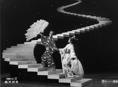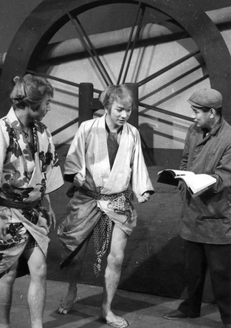 内容は「弥次・喜多どたばた道中のたぬき版ミュージカル」。実にたわいのないものです。お客さんは演技というより、スターの歌や踊りがお目当てですから、それでよかったんです。当時、会社の宣伝部が作ったPR文には“数あるお正月映画の中でいちばん楽しく、いちばん華やかな内容を持つタヌキ・ミュージカル映画”とあります。私の七作目ですが、まだ「新進気鋭の監督」になっています。 「たぬき」ものは大映のお家芸といってよく、年末、年始向けに多く作られました。雷ちゃん主演では59年12月から60年1月にかけて『初春狸御殿』が上映されました。歴史は古く、ルーツは合併(42年)前の新興キネマで、木村恵吾監督が手がけた『狸御殿』(39年)あたりにさかのぼります。流行歌手やコメディアンが登場するスタイルはこのころ固まったはずです。いずれにせよ、いわばファンへのお年玉みたいなものでした。 ミュージカル映画は助監督時代、木村組で、携わった経験はありますが、監督としては初めて。「モダンに作ろう」と、私の発案で音楽は当時、売れっ子だった浜口庫之助さんに依頼しました。前年(59年)スリーキャッツの歌でヒットした彼の「黄色いさくらんぼ」は当時、とても目新しく、彼なら面白いメロディーをつけてくれるだろう。と狙いをつけたわけです。映画用に作ってくれたのは十数曲でした。場面に合わせ、すべてオリジナルです。おかげで映画はテンポよくにぎやかになり、期待通りの仕事をしてくれました。 雷ちゃんの歌ですか。かなりレッスンを受けさせた記憶があります。可もなく不可もなく、といったところではなかったでしょうか。対照的に上手だったのが勝ちゃんです。長唄の師匠のせがれですから、当然といえば当然でしょう。楽譜は読めないけれど、下手な歌手よりうまかった。劇中、二人がデュエットしているので、ぜひご覧になって下さい。 せっとづくりは、昨年11月、京都で座談会をした美術の内藤昭さんとの共同作業でした。時代劇なのにシャンデリアや金髪のかつら、アメリカのミュージカルにみられるような階段を使っています。最初から遊んでやるつもりで二人とも笑って乗ってました。大映の「たぬき」ものは確か、これが最後のはずです。作られていたとしても、客は入らなかったでしょう。当時、テレビで似たような番組をやってましたから。昔なら映画館に行かなければならなかったけれど、このころにはお茶の間でスターを見られるようになっていました。だから、やめてよかった。 <浜口庫之助:昭和30〜40年代を中心にヒット曲を生み出した作詞、作曲家。代表作に「僕は泣いちっち」(守屋浩)、「バラが咲いた」(マイク真木)、「夜霧よ今夜もありがとう」(石原裕次郎)など。90年12月没。> <映画館の入場者は、58(昭和33)年の11億2745万人をピークに減り始める。60(昭和35)年にはNHK、民放のカラー放送が本格的に始まり、映画産業の斜陽に拍車をかける。>