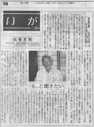 田中さんは終戦をスマトラ島(インドネシア)で迎え、1946(昭和21)年に捕虜生活を終え帰国し、48(昭和23)年に大映京都撮影所に入社しました。以来、半世紀以上も映画作りにかかわっています。 黒澤明監督の『羅生門』(50年)、溝口健二監督の『雨月物語』(53年)、市川崑監督の『炎上』(58年)などの作品に助監督として加わりました。監督は『化け猫御用だ』(58年)から。勝新太郎の代表作の一つ『悪名』(61年)、市川雷蔵の『眠狂四郎殺法帖』(63年)など、娯楽作品を中心に49本に上ります。現在はフリーの立場で、テレビ映画の撮影や芝居の演出などにも携わっています。 どのような心境でエッセーにしたのだろう。直接、うかがいたくなり、自宅を訪ねました。 全国の映画館の入場者数が、全盛期より大幅に落ち込んでいる現状は、華やかな時代を知る人にとっては耐えられないのではないか。「深い意味はないんです。思いつきで書いただけ。」先入観は空振りに終わりました。「映画館を出た観客の胸に、何かを残したい。見て楽しんでほしい。そう考えてやってきただけです。」穏やかな口調で語ります。「自分の作品でも、ビデオで見たくありません。暗い映画館の中で、大きなスクリーンでなければ、作品の価値は半減してしまうんです」 巨匠と称される監督は、どのように作品に取り組み、役者や助監督らを育てていったのだろう。田中さんと親交の深かった勝新太郎や市川雷蔵ら、役作りにかけた俳優の姿を知りたい。最盛期の撮影所の熱気は?構想からスクリーンに映し出されるまで、いろいろ曲折もあるんだろうな。メモを取っているうち、聞きたいことが、どんどんふくらんでわくわくしていきます。 「田中さんを通してみた映画作りにかかわるもろもろのことを、連載記事にしたくなりました」「古い話を読みたい人なんていないでしょう」「立ち会った人しかわからないその場の空気や息づかい、古き良き時代をのことを、映画ファンでなくても知りたい人は多くいるはずです。少なくとも、私はそうです。ぜひ教えてほしいのです」「いいですよ。いろいろなエピソードも紹介しましょう」。快諾していただきました。 かくて、田中さんのインタビュー記事を近く始めます。ご期待ください。 (毎日新聞名張支局長・小泉健一) |