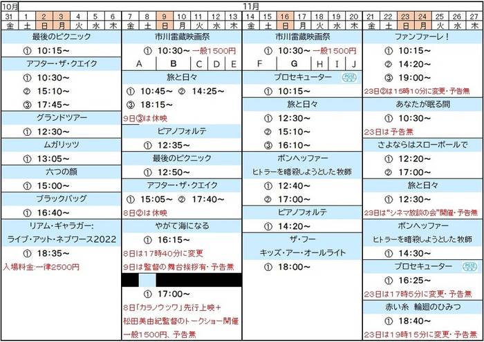 ◆「新源氏物語」 11月7日・8日の2日間上映 1961年/102分 監督:森一生 共演:寿美花代、若尾文子、中村玉緒 雷蔵源氏と豪華女優陣が魅せる華やかな王朝絵巻! ◆「陸軍中野学校」 11月9日・10日の2日間上映 1966年/96分 監督:増村保造 共演:加東大介、待田京介、小川真由美 増村監督が雷蔵と挑んだ和製スパイ映画の名作! ◆「弁天小僧」 11月11日の1日のみ上映 1958年/86分 監督:伊藤大輔 共演:勝新太郎、青山京子 “知らざあ言って聞かせやしょう” 雷蔵の名セリフも鮮やかな傑作時代劇! ◆「華岡青洲の妻」 11月12日の1日のみ上映 1967年/99分 監督:増村保造 共演:若尾文子、高峰秀子 有吉佐和子の原作を鋭く力強く映し出した増村保造監督の傑作! ◆「破戒」 11月13日のみ上映 1962年/118分 監督:市川崑 共演:長門裕之、船越英二 島崎藤村の代表作を雷蔵×市川崑×和田夏十が映画化した名作。 ◆「炎上」 11月14日・15日の2日間上映 1958年/99分 監督:市川崑 共演:中村鴈治郎、仲代達矢 三島由紀夫の「金閣寺」を映画化!雷蔵現代劇第1作目。 ◆「ぼんち」 11月16日・17日の2日間上映 1960年/105分 監督:市川崑 共演:若尾文子、中村玉緒 雷蔵×市川崑×大映京都が描き出した、船場商人の生き様。 ◆「眠狂四郎炎情剣」 11月18日のみ上映 1965年/83分 監督:三隈研次 共演:中村玉緒、西村晃 おとりと知りつつ炎の肌を抱く…艶やかな狂四郎の魅力あふれる傑作! ◆「婦系図」 11月19日のみ上映 1962年/99分 監督:三隈研次 共演:万里昌代、船越英二 三隈研次監督が描く雷蔵の爽やかな美しさが薫る泉鏡花の純愛巨編。 ◆「ある殺し屋」 11月20日のみ上映 1967年/82分 監督:森一生 共演:野川由美子、成田三樹夫、小池朝雄 綿密なプロットとカメラワークが冴えるフィルム・ノワールの傑作。