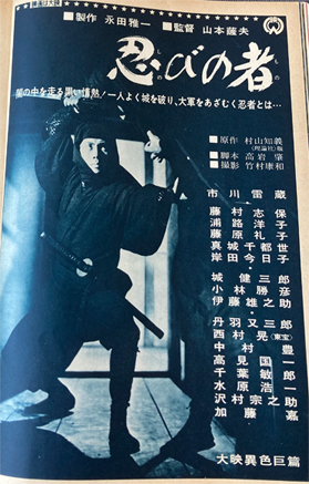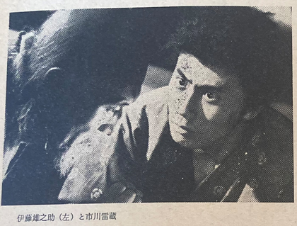 数日あと、主演者の雷蔵氏が出るときいて、またセットをのぞいたが、今度は伊藤氏が百地三太夫とあって、禿頭の老人の扮装で、簡単な忍びの者の服装━これが兵隊の制服にあたるのだが、このとき黒づくめでなく、青黒い着物をきていた。多分礼装なのだろう━をした雷蔵氏に、手裏剣を投げるシーンだった。父と愛人の死の真相を知って憤った五右衛門が、三太夫に忍者をやめるとつめよると、三太夫が、冷たく「一生おれの手から逃げられるものか」と笑う場面である。