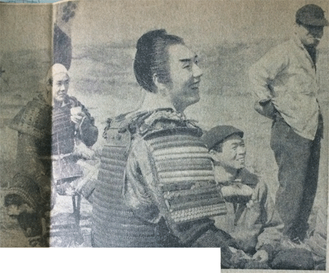 食事のあとのひとときを雷蔵はスタッフのなかに入りまじって、いかにもすがすがしそうに雑談をはじめる。遠くの方からドドーンと砲声がひびいてくる。“なんだい?あの音は・・・”と振りかえると、地平のかなたに黒い硝煙が立ちのぼっている。“ああ、自衛隊の演習だナ。自衛隊の近代戦と桶狭間戦をおなじとこでやっているわけか”と雷蔵君がちょっと小首をかしげる。 その様子がおかしくてみんながどっと笑った。さっき駆けたとき落馬して、腰をしたたかに打ったという北原義郎に、雷蔵は“大丈夫ですか”と何度も念をおしていた。 |