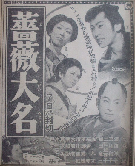雷蔵のこうした友達思いは有名なもので、こうした友情出演は今までに二度程ありました。田中徳三監督第一回作『化け猫御用だ』で火の番の夜廻。井上昭監督『ゆうれい小判』でのカゴカキの役でした。今度は又、違った感じの役ですから御期待ください。尚、この『薔薇大名』は十二月七日に封切られます。
