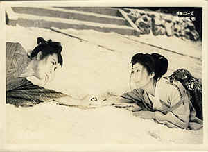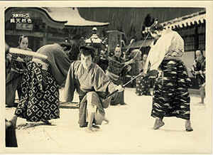 『薄桜記』はさっきの夕焼けとか雪とか、画面がきれいですね。それから、紙のお雛様が素晴しい、雷蔵の典膳がこれから出張の旅に出るというときに、新婚の妻に別れを言って、そのあと抱き上げて部屋へ入ってゆくと、画面には紙の男雛と女雛だけがうつるという、いいシーンがありますね。ラブシーンになるわけですが、それをもろにうつさないで、一対の紙雛だけをポンとうつす。とっても情感のあふれる描き方ですね。
