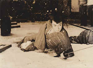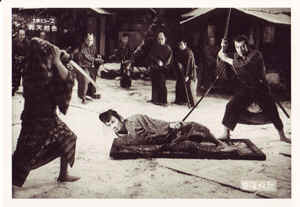 雷蔵は片腕がなくて、片足も短銃でやられていて立つことができない。で、戸板で運ばれて、雪の境内を片手片足のまま地面を転げ回りながら、すさまじく闘う。ですから、むごたらしいといえば、とてもむごたらしいのですが・・・。