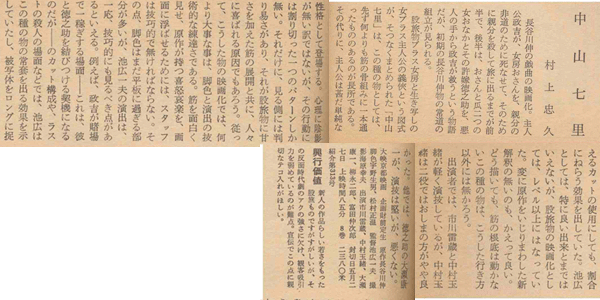 股旅物プラス女房と生き写しの女プラス主人公の義侠という図式が、そつなくまとめられた『中山七里』は、この種の物としては、先ず何よりも筋の骨組みに一本通ったもののあるのが長所である。その代りに、主人公は甚だ単純な性格として登場する。心理に陰影が無い訳ではないが、その行動には割り切った一つのパターンしかない。それだけに、見る側には判り易さがあり、それが股旅物に甘さを加えた筋の展開と共に、人々に喜ばれる原因でもあろう。従って、こうした物の映画化は、何より大事な事は、脚色と演出の技術的な練達さである。