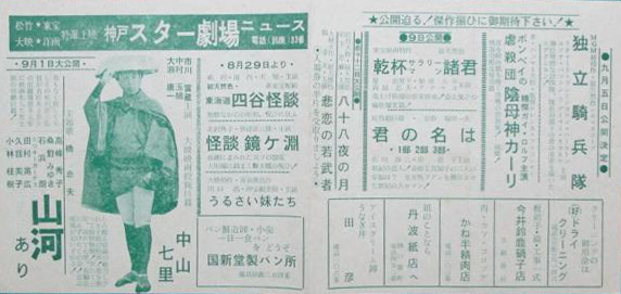 市川雷蔵のやくざものは「股旅姿はやっぱり雷さま」といわれるほど定評のあるものですが、この、『中山七里』は、先ごろ華燭の典を上げ、ますます意欲の出てきた雷蔵の初仕事であるだけに大いに期待されます。また、彼が芸能界にデビュー初舞台を踏んだのが、矢張りこの「中山七里」といえば、話は少々因縁めきますが、これもひとつの話題です。それから、市川雷蔵とはお馴染みの橋幸夫が結婚祝いに、主題歌をプレゼント、レコードの発売に先立って全国ファンに披露するのも待ち遠しい限りです。