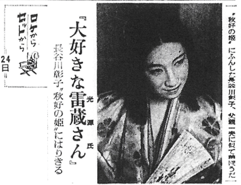 六年ぶりの映画出演、それも他社出演の宝塚スター寿美は、雷蔵の熱狂的なファンのひとり。その雷蔵(彼も寿美のファン)が「華麗なる千拍子」の舞台を見て相手役に選んだもの。彼女の役は光源氏の母親桐壺と、彼が恋い慕う藤壺の二役。作品的にみて、雷蔵の光源氏とのラブシーンは重要なポイントでもあるわけだが、彼女は「宝塚のファンのイメージをそこなわないように、できるだけ美しいムードの中で演じたい」といっていたが、どうしてこの日の撮影では濃艶なポーズが収められた。