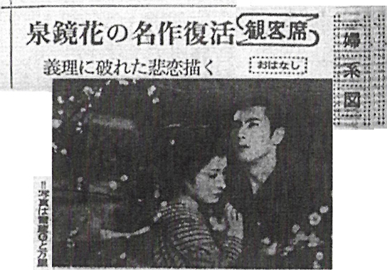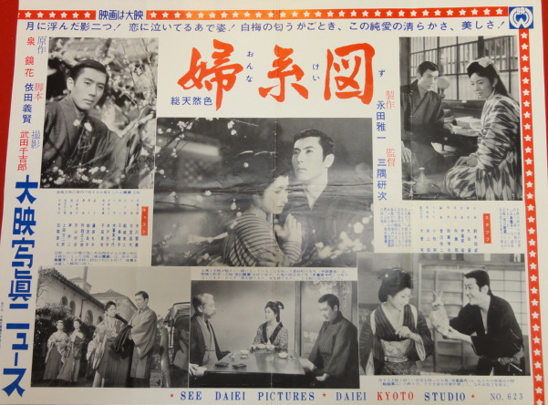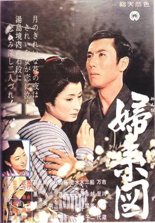 “お蔦・主税のこころ意気・・・”の歌の文句でよく知られ、映画に舞台に幾度となくとり上げられた泉鏡花原作の『婦系図』が、折からのリバイバル・ブームに波に乗って大映京都で、市川雷蔵の主税、若尾文子のお蔦で三隅研次監督のメガホンでクランクを開始した。 ヒロインの若尾文子は、前作『雁の寺』の熱演で体をいためたために、まず雷蔵の主税が書生をつとめる酒井俊蔵邸のセットからスタートした。スリの少年だった主税だが酒井に拾われ、人間的にも成長してゆくが、酒井家の令嬢妙子がいあmではすっかり立派になった主税に秘めやかな思慕を寄せるといったところがこの日のシーンである。妙子に扮するのは新東宝から大映入りをした三条魔子で、『若い奴らの階段』『家庭の事情』についでこれが三本目というわけ。 そこで『婦系図』について感想を聞くと「原作は読みましたが、映画やお芝居は全然知らないんです。子供の頃、見たような記憶がホンノリとはあるんですけれど・・・、でも私が是非やりたいと思っていた純情な娘役なので、地で行けると思います」と大変な張り切りかた。 また時代劇については「演ってみたいとかねがね思っていました。でもお姫さまよりは庶民的な娘役がいいと思います。雷蔵さんnようなベテランとご一緒すると自然に足が震えるんです」と首をすくめていた。 これに対して雷蔵は「『婦系図』は不思議にこれまで一本も見てないんです。だからかえって自由に僕なりの主税が出せると思ってるんです、この作品に関する限りお互いに一年生なんだからご心配なく」と三条魔子を励ましていたが、クランク早々、和やかな雰囲気の中にも「新しい“婦系図”」(三隅監督の話)への意欲がみなぎっていた。 ★梗概★ 帝大教授酒井俊蔵の恩情で、立派な教育を受けた早瀬主税は、兄妹のようにして育った酒井の娘妙子が自分に恋をよせているのを知り、これを受けては義理ある先生にすまぬと、酒井家を出た。そして魚屋めの惣の世話で、かねてから恋仲だった柳橋の芸者お蔦と、先生には内証で世帯を持った。かつての酒井先生の情人で、妙子の実の母であるお蔦の姉芸者小芳は、身分違いの恋の不幸を主税に説くが、主税は、芸者を妻にするのが出世の妨げなら出世せぬまで−と、初志を変えない。 ところが、ふとしたことで主悦に恨みを持つ、静岡の権勢家の息子で同窓の河野英吉は、さまざまな策動をして主税をスキャンダルにまきこみ、さらにお蔦のことを酒井先生に告げて処分を迫った。酒井は主税をかばいつつも、お蔦とは別れさせるといわざるを得ない。酒井から、俺か女かどちらかを選べと迫られ、主税はやむなくお蔦と別れることを決心し、散歩にことよせてお蔦を湯島境内へさそった。思いもかけぬ別れ話にお蔦は歎き悲しむが、ついに得心して身を引くことを承知した。そして、髪結いをしているめの惣の家内のところで、すき手として働くことになった。 河野の卑劣な行為を怒った主税はめの惣から、河野の当主の夫人がお抱えの御者と密通し、子までなしたいきさつを知り、この事実をもって復讐しようと、静岡へ去った。河野一家に接近してドイツ語私塾をひらいた主税に、政略結婚で河野家の不幸な娘はぐんぐんひかれてきた。その娘に、主税は母親の秘密を暴露する。それを立聞きした夫人の銃弾で、主税は重傷を負い、病床の人となった。 一方、お蔦は風邪をこじらせて死の床にあった。たまたま訪ねた妙子の連絡で酒井も駈けつけた。酒井の命令で、めの惣が静岡に飛ぶが、主税は帰らない。「芸者にも真実な女がいますよ」と、お蔦は酒井に訴えて息絶えた。ようやく傷のいえた主税は、河野家の当主が夫人を射殺した日、東京へ帰った。今は亡きお蔦との思い出深い湯島天神にたたずむ主税の背に、梅の花が散った。(キネマ旬報) 早瀬主税は、十二の時、雑踏の中で、帝大のドイツ文学教授酒スリ損じたが、酒井の温情によって家に伴われ、書生として養育された。 それから十年、その彼に、兄妹のようにして育った酒井の娘・妙子がいつか恋情を向けて来る。妙子の好意を受け入れては義理ある先生にすまないと決心した主税は、酒井の家を出、知り合いの魚屋めの惣の世話で家を見つけ、かねてから恋仲だったお蔦と先生に内緒で所帯を持つ。 お蔦の姉芸者小芳は、酒井の娘妙子は実は自分の生んだ子だが、日陰者の身ゆえに、親とも名のれぬありさまと告白して、身分の違う二人の結ばれる不幸を説く。主税は驚くが、芸者を妻にして妨げになるなら、出世はせぬまでと心意気を語った・・・。だが、ふとした事件から主税に芸者の妻のあることを知った酒井は、主税を呼び出し、お蔦と別れることを命じる。 明治四十年の原作発表以来、新派の舞台に、スクリーンに、幾度となく天下のファンの紅涙をしぼり、広く人口に膾炙しているお蔦・主税の悲恋を描いた文芸大作。 |